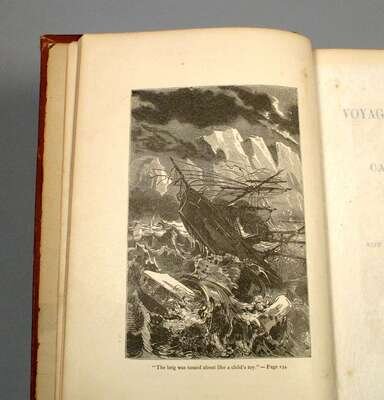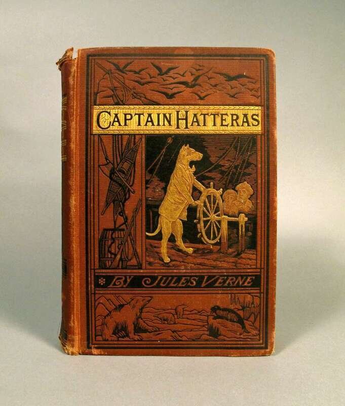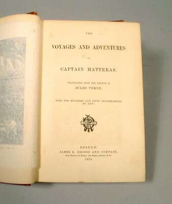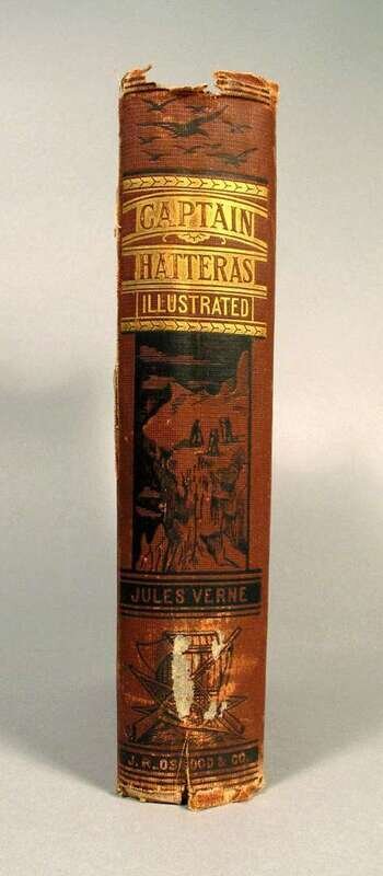 Verne, Jules. The Voyages and Adventures of Captain Hatteras. Boston: J.R. Osgood & Co., 1875. 1st Amer. ed. 8vo, orig. pictorial brick red cloth; edge wear, head and foot of spine frayed. Binding shaken. Some internal spotting.