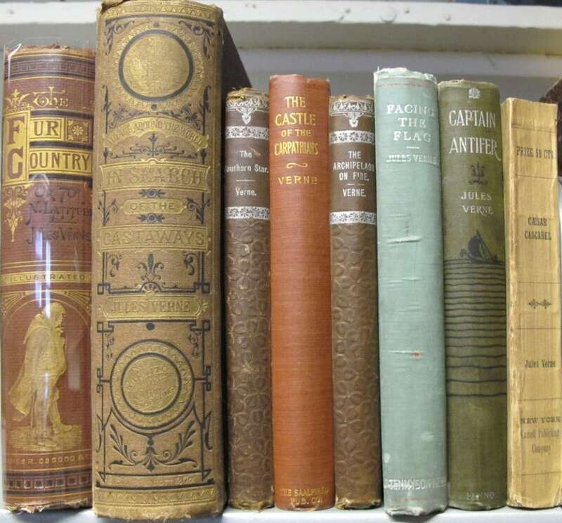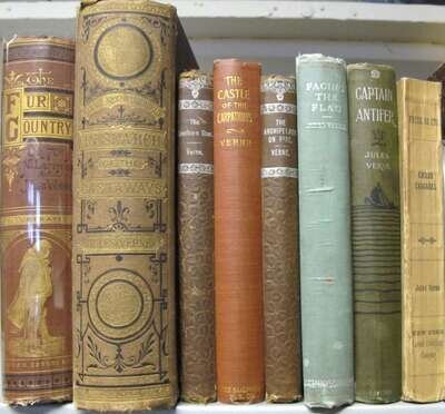 Verne, Jules - American Imprints: The Fur Country.. Boston: James R. Osgood and Co., 1874 [1873]. 1st Amer. ed., post-dated title page. 8vo, orig. gilt-pictorial brown cloth; corners worn, wear to head and foot of spine. Myers 27. * In Search of the Castaways.. Hartford, Conn: Columbian Book Company, 1873. 8vo, orig. gilt-pictorial plum coth; spine faded, edge wear. Casing with "J.B. Lippincott" at foot of spine, title page on stub. * The Southern Star. N.Y: George Munro's Sons, [c1855]. Later ed. 8vo, orig. brown cloth; head and foot of spine worn, bumped corners. Toned pages. * Facing the Flag. N.Y: F. Tennyson, (1897). Later ed. 8vo, pictorial green cloth; some staining. Old marks to front matter. * The Castle of the Carpathians. Akron, Ohio: The Saalfield Pub. Co., 1900. Later ed. 8vo, orig. pictorial brick red cloth; light edge wear. Generally clean. * The Archipelago on Fire. N.Y: George Munro's, [c1900] Crescent Edition. 8vo, orig. brown cloth; extremities rubbed. Internally toned. * Captain Antifer. N.Y: R.F. Fenno & Co., (1895). 1st Amer. ed. 8vo, pictorial green cloth; corners bumped, light edge wear. Former owner's name on front free endpaper. Myers 6. * Caesar Cascabel. N.Y: Cassell Publ. Co., May 26, 1892. 8vo, orig. pictorial self wrappers; light wear and some staining. Part of Cassell's Sunshine Series. Illus.