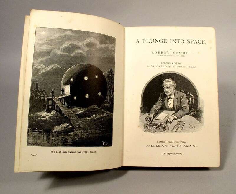 Verne, Jules, preface by; Cromie, Robert. A Plunge into Space. London & New York: Frederick Warne and Co., (1891). "Second Edition". 8vo, orig. pictorial blue cloth; corners bumped, light wear. Former owner's inscription on front free endpaper.