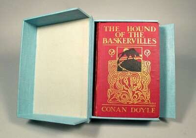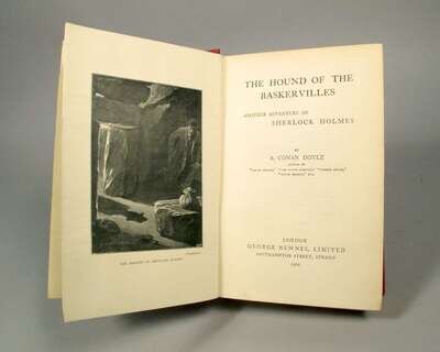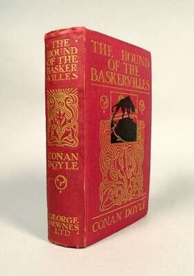 Doyle, A. Conan. The Hound of the Baskervilles. London: G. Newnes, 1902. 1st ed. in book form, 1st issue. 8vo, orig. gilt-lettered & decorated, gilt & black pictorial stamped red cloth; occasionally slightly scuffed, light edge wear, spine ends very slightly frayed. With 16 plates. Minor spotting to endpapers. Bookplates on front endpapers. In custom fall-down cloth box.