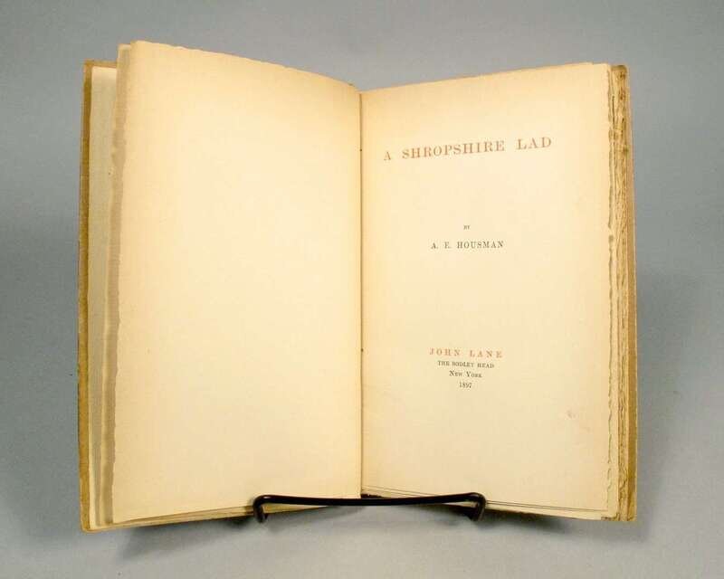 Housman, A.E. A Shropshire Lad. New York: John Lane, 1897. 1st ed., 1st issue. Sm. 8vo, orig. 1/4 paper vellum & bds, paper spine label; border of bds discolored, edges rubbed, some chipping to label - affecting capitol "H" in "Housman". Untrimmed, internally clean. In custom cloth case & chemise. 1 of 150 for America of 500 1st ed. copies.