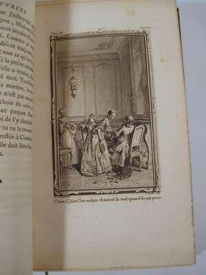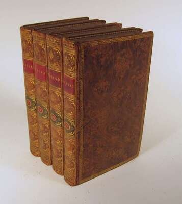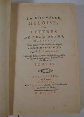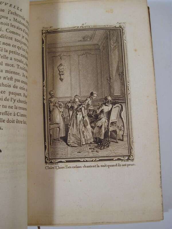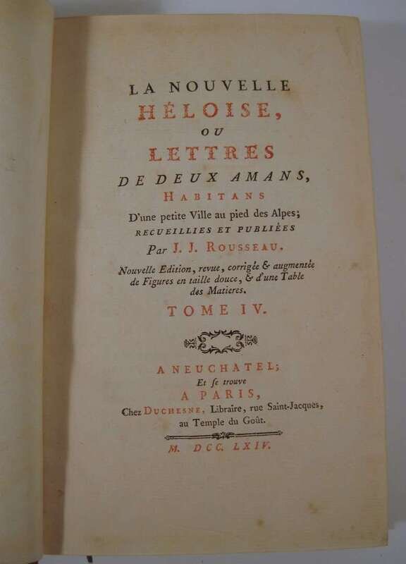 Rousseau, J.J. La Nouvelle Heloise ou Lettres. Paris: Duchesne, 1764. 8vo, contemp. gilt-decorated mottled calf, red & green morocco spine labels; corners bumped, hinges repaired, other edge wear. Engraved plates. With light discoloration to page edges & 19th century watercolor embellishments on front free endpapers. Armorial bookplates on front paste-downs.