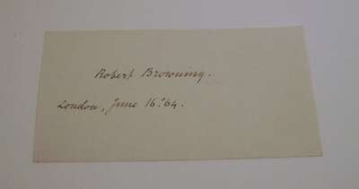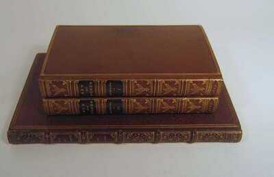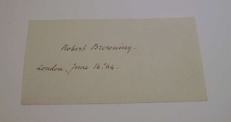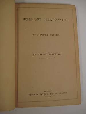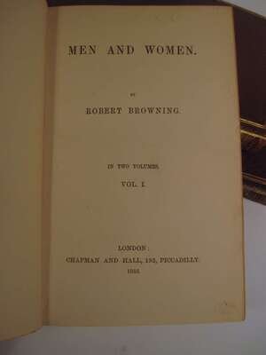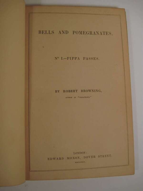 Browning, Robert: Bells and Pomegranates. No(s) I-VIII. L: Edward Moxon, 1841-1846. 1st ed. of the orig. 8 prts in 1 vol. Tall 8vo, later 19th century full crushed brown levant morocco, gilt, richly gilt floral spine compartments, turn ins gilt, a.e.g; joints & corners slightly scuffed, by Riviere. With orig. wrappers of part V bound in, 1/2 title in part 2 present (all called for.) Bookplates of Walter Wallace & Gordon Abbott on front endpapers. Internally clean. Cut autograph signature, dated, London June 16, '64, of Robert Browning laid in. Haywood 253. * Men and Women. L: Chapman and Hall, 1855. 1st ed. 2 vols, 8vo, early 20th century full brown straight grained morocco gilt, inner dentelles gilt, t.e.g., gilt-paneled spine ends & corners slightly scuffed, a few unobtrusive smudges to covers by Zaehnsdorf. Without advert leaf. Broughton A59.