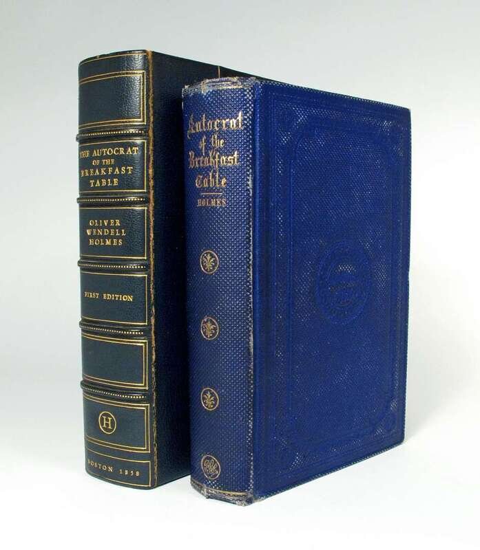 (Holmes, Oliver Wendell) The Autocrat of the Breakfast Table. Boston: Phillips, Sampson, 1858. 1st ed., 1st ptg. 12mo, orig. blue cloth, gilt-lettered spine, light edge wear, spine ends slightly frayed, joints slightly scuffed. With vignette title + 8 plates, complete in 1/2 title, blank, fly leaves, period in inprint. Tight, bright copy in custom 1/2 morocco fall-down box. BAL 8781- bdg A.