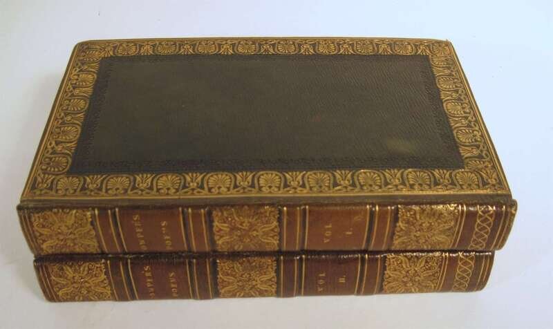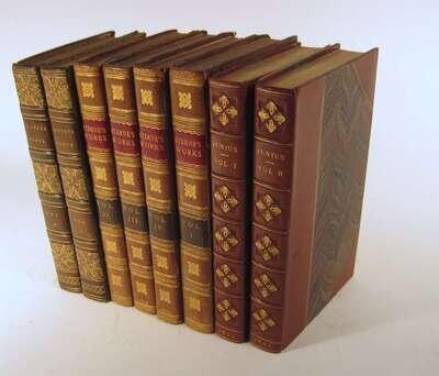 Fine Bindings: Cowper, William. Poems. London: W.H. Reid, 1820. 2 vols. 8vo, foliate gilt decorated green morocco, raised spine bands, gilt floral compartments, a.e.g.; spines a little faded, light edge wear. Illus. Some internal dampstaining and spotting. * Sterne, Laurence. The Works. London: Sharpe and Son, 1819. 4 vols. 8vo, contemp. gilt-decorated calf, red and black spine labels; hinges repaired, wear to surfaces. Replaced endpapers. Scattered spotting. * Junius. Letters. London: T. Bensley, 1801. 2 vols. 3/4 brown morocco & marbled bds; raised spine bands, gilt compartments; minor wear. Some light to moderate spotting.