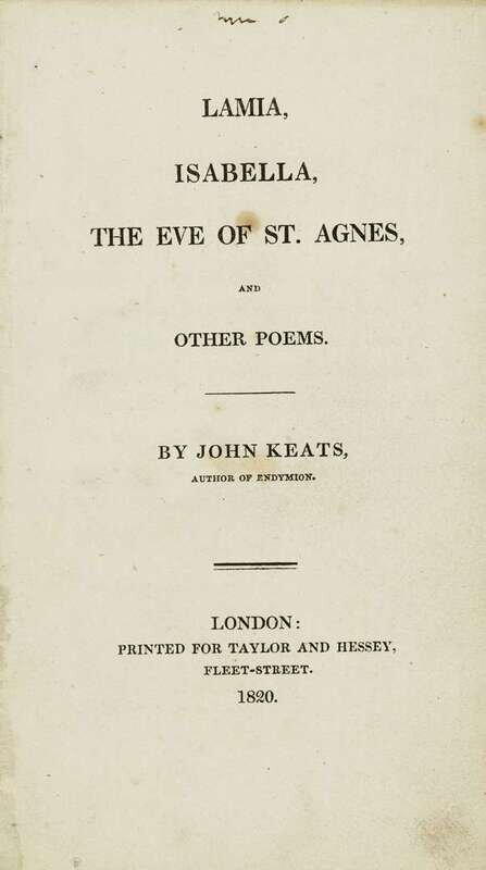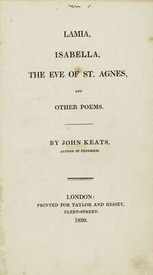 Keats, John. Lamia, Isabella, the Eve of St. Agnes and other Poems. London: for Taylor and Hessey, 1820. 1st ed. 12mo, orig. bds, paper spine label, uncut; front joint starting to crack, label scuffed, some minor chipping. Complete with 1/2 title & 4 adverts leaves at back. In custom morocco solander case.