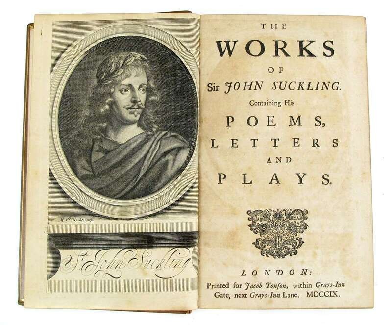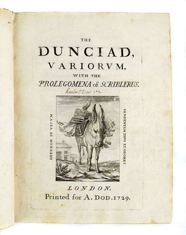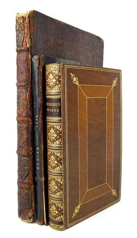 English 18th C. Imprints - Poetry & Drama: (Pope, Alexander.) The Dunciad, Variorum. With teh Prollgoemna of Scribleurs. L: A. Dod, 1729. 1st complete ed. of the 1st 3 books. 4to, contemp. calf; heavily scuffed, occasionally blistered & worn. Engraved title. Minor smudging to title, but tall crisp copy. Griffith 211. * Suckling, John. The Works of...containing his Poems, Letters and Plays. L: J. Tonson, 1709. 1st ed. thus. 8vo, late 19th-century paneled, light brown morocco inlaid speckled calf, gilt, spine richly gilt, a.e.g., morocco spine label; joints & corners a little scuffed. Frontis port. Light to occasionally moderate foxing. Trimmed. * (Mallet, David.) Elvira: A Tragedy. L: A Miller, 1763. 1st ed. 8vo, early 20th century black calf & bds; rubbed, covers detaching. Good margins, slightly toned.