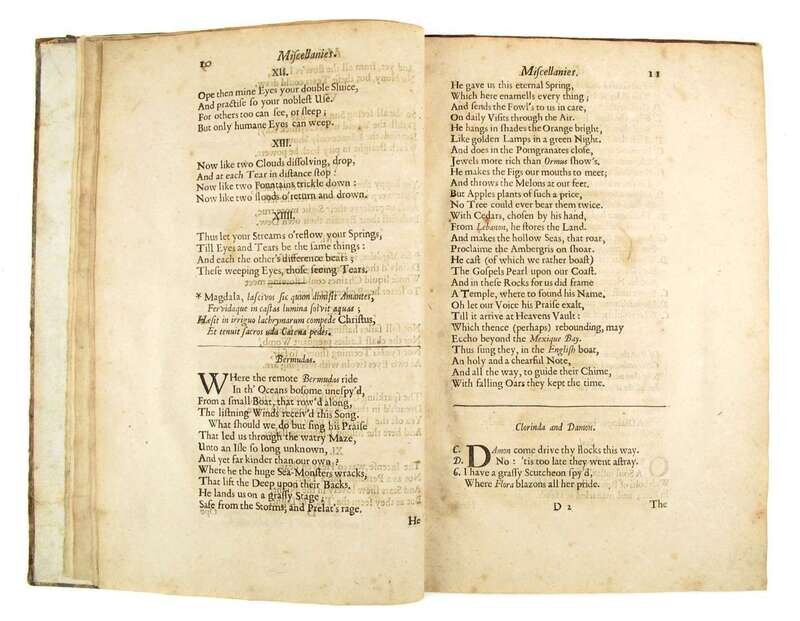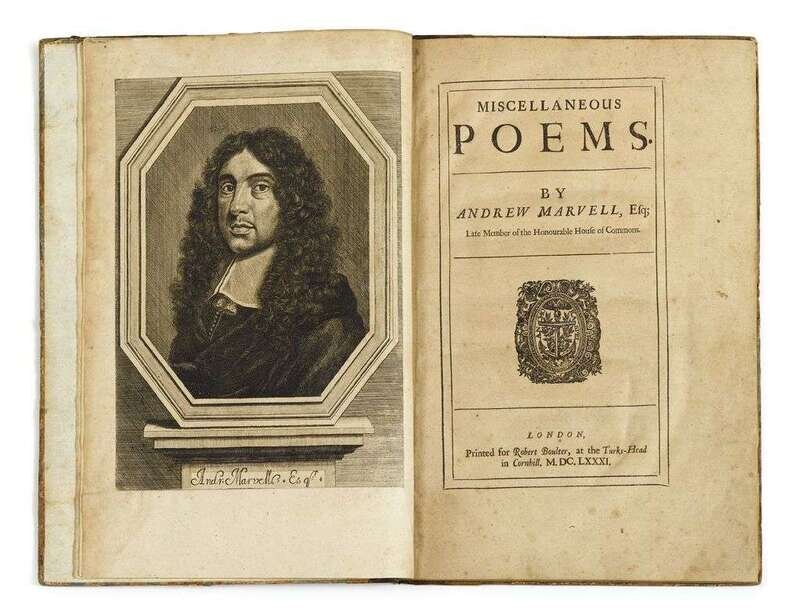 Marvell, Andrew. Miscellaneous Poems. London: for Robert Boulter, 1681. 1st ed. Folio, early 18th-century sheep-backed marbled bds, red morocco spine label; scuffed, occasionally lightly blistered. Frontis port. (cut close & laid-down). Title-page slightly toned, scattered light foxing, a few minor ink stains & a few minor expert internal repairs. Attractive, tall copy - leaf size 11 1/2 x 7 5/8 inches; 292 x 147mm. Lacking as usual, the 16 leaves of 3 poems on Cromwell, also lacking front blank.