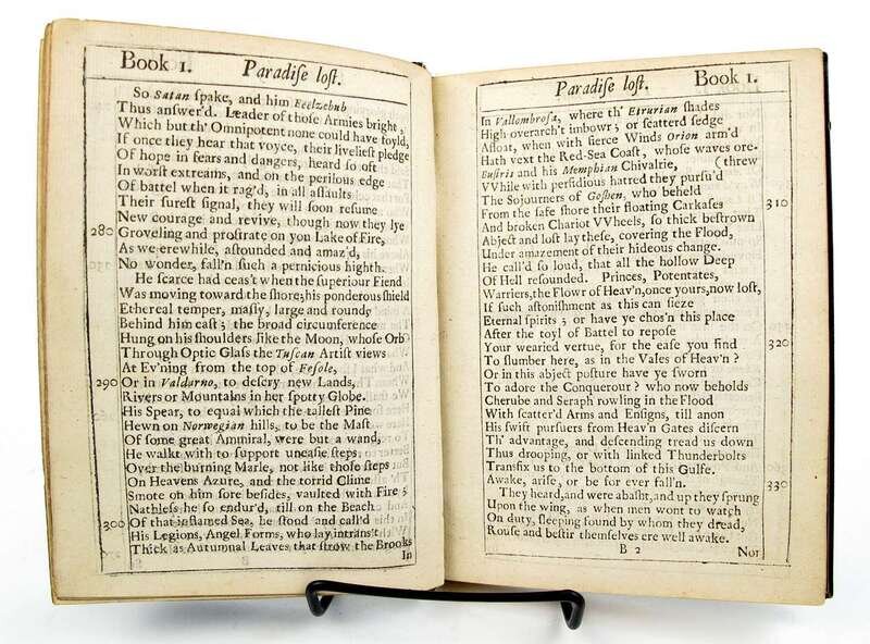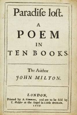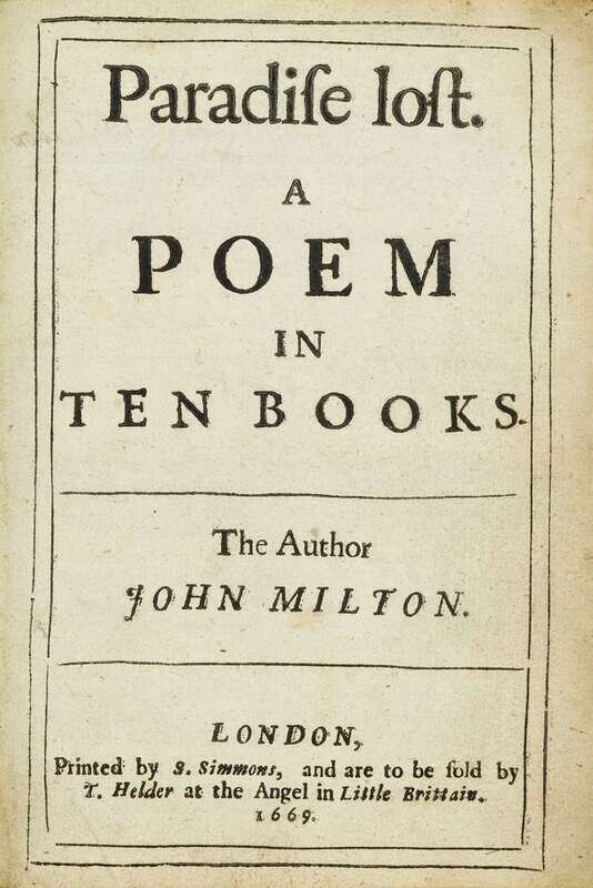 Milton, John. Paradise Lost. A Poem in Ten Books. London: S. Simmons...sold by T. Helder, 1669. 1st ed., 5th title page. 4to, late 19th century full dark blue-green straight-grained morocco, gilt extra, a.e.g; minor wear. Trimmed - no loss to ptg, washed - minor scattered spotting. Without the front blank and note to the reader.