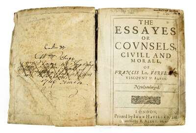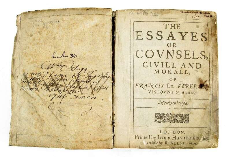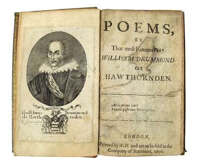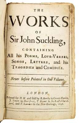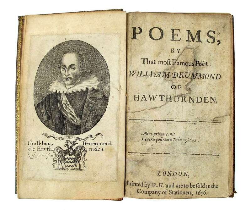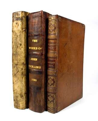 English 17th C. Literature & Philosophy: (Bacon, Francis.) The Essayes or Counsels Civill and Morall,... L: John Haviland, 1629. 3rd ed. 4to, contemp. limp vellum; moderately worn & soiled. front matter darkened, foot of title page chipped - loss of a few letters in imprint, lacking front & back blank & the 4pp "of the colours of Good and Evil", at back, variant with p80 misnumbered "08" & p324 misnumbered "243." STC 1150; Gibson 16. * Drummond, William. Poems. L: W.H., 1656. 1st ed. 8vo, 18th. C. calf, spine gilt, morocco spine labels; scuffed. Moderate internal spotting & foxing, trimmed- often shaved close, t-p restored. Port. present. Armorial bookplate of Drummond of Hawthorne. Wing 2201. * Suckling, John. The Works. L: H.H. for R. Bentley, J. Tonson, T. Bennet, F. Saunders, 1696. 1st ed. 8vo, contemp. paneled calf; rubbed & blistered, rebacked. Lacking port. A few leaves repaired, moderate foxing & spotting. Wing S-6120.