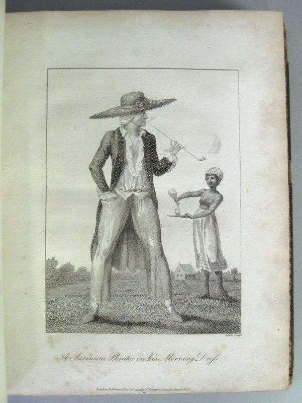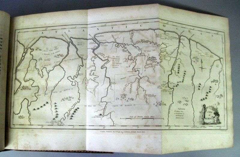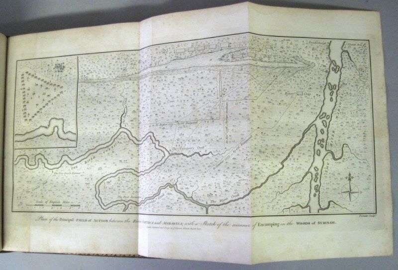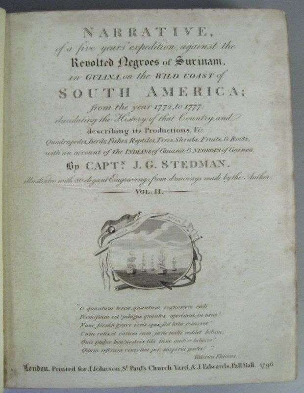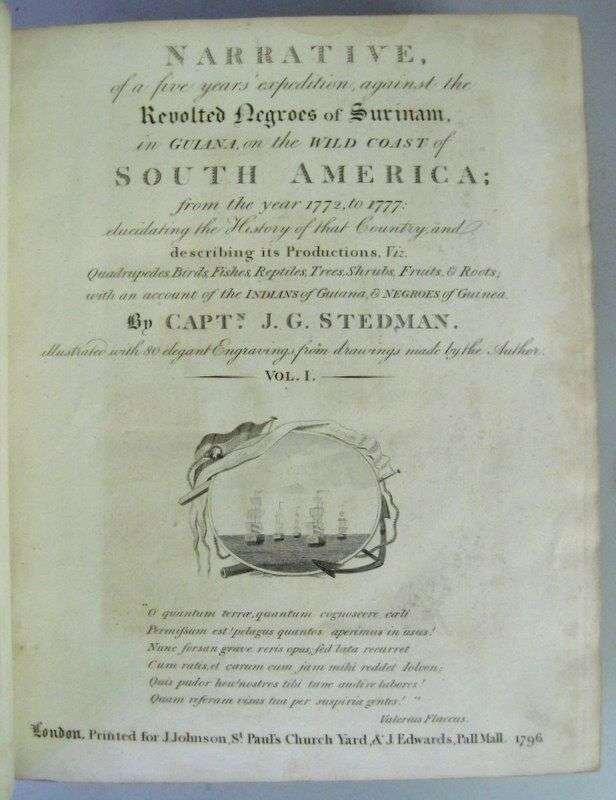 Stedman, J.G, Captain. Narrative, of a Five Years' Expedition, against the Revolted Negroes of Surinam, in Guiana, on the Wild Coast of South America; from the year 1772, to 1777. London: J. Johnson, 1796. 1st ed. 4to, contemporary gilt ruled calf, gilt-lettered spines; extremities rubbed, surface scuffed, hinges reinforced. With frontis, list of subscribers, 80 maps and plates, some engraved by William Blake; one plate repaired. Minor to moderate scattered foxing, small wormhole lower corner to rear of book. Armorial bookplate of William Feilden on front pastedowns.