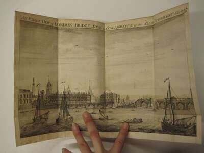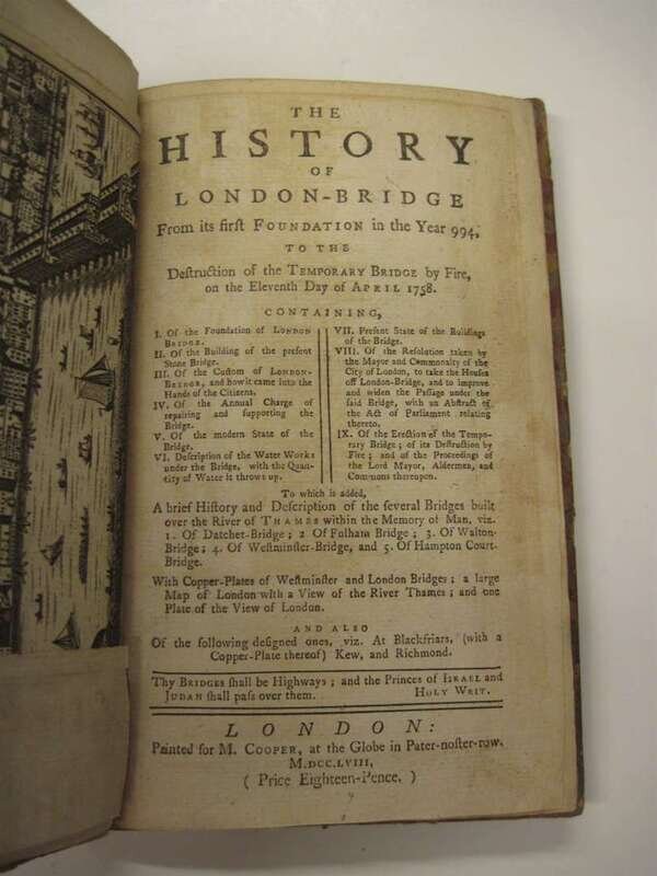 [English History & Architecture.] The History of London Bridge. London: M. Cooper at the Globe, 1758. 8vo, later marbled bds; rebacked, edges worn. With 6 fold plates & 1 map. Occasional light discoloration. Newspaper clipping pasted to front paste down.