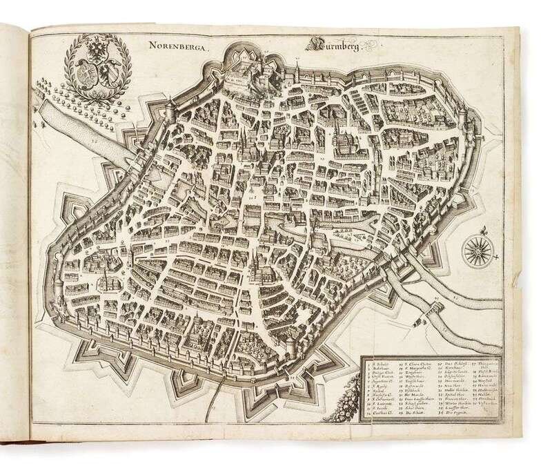 Merian, Mattheus: Topographia Franoniae - Topographia Archiepiscopatum, Moguntinensis...- Topographia Bavaria. Frankfurt: Meiran Mattheus, [1646-1656]. With 3 engraved title pages & 28 maps and 110 town views (mostly folding or double-page). Scattered cellotape repairs to text and plates, no significant losses. The first t-p with 2 lib. ink stamps to t-p, small edge tears 2 cello-tape repairs, soiling. Scattered discoloration.