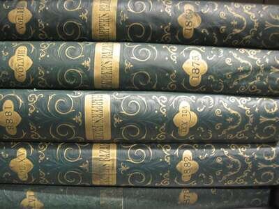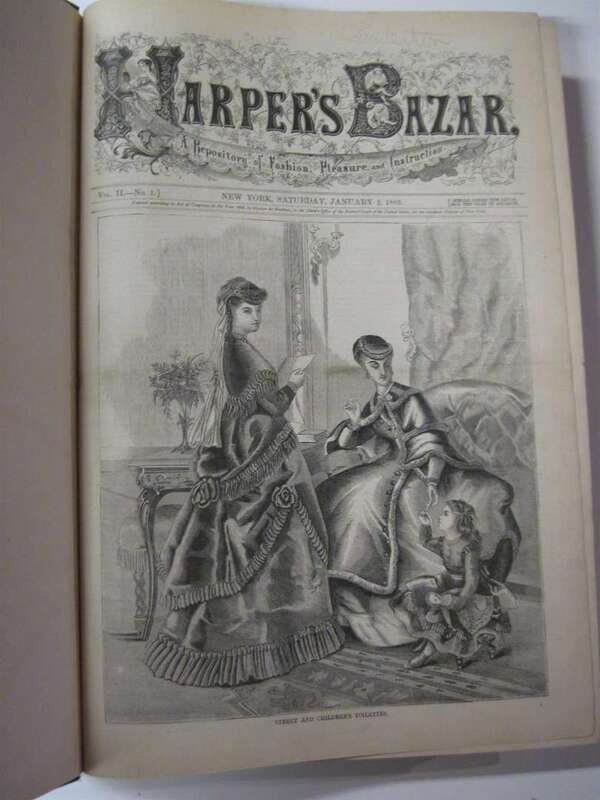 [Fashion.] Harper's Bazaar: A Repository of Fashion, Pleasure and Instruction. New York: Vols III, VI, XVIII, X, XIII, XV, XVI, XVIII and XXI. 1870, 1873, 1875, 1877, 1880, 1882, 1883, 1885 and 1888. Folio, orig. gilt-foliate pub. green cloth; minor wear. Bright, generally clean copies. Illus. and folding patterns.