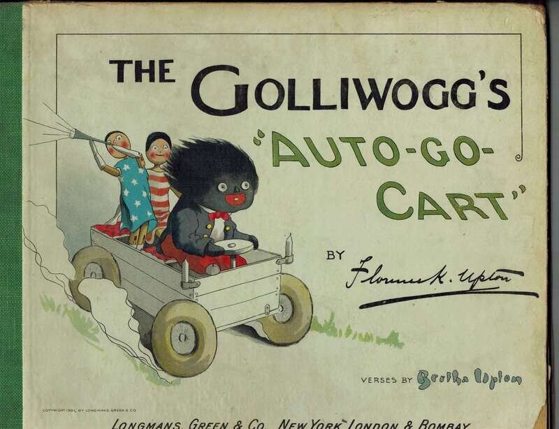 Upton, Bertha & Florence K. The Golliwogg's "Auto-Go-Cart". New York: Longmans, Green, 1901. 1st ed., Amer. issue. Oblong 4to, orig. color pictorial bds; corners bumped & rubbed, other moderate edge wear. Front hinge starting to separate, back hinge stressed, some chipping at endpaper gutters. With color pictorial title + 31 full page color pictorial illus (2 forming a double page image.) Vertical crease to title & 1 color illus, very occasional minor dust smudging. Ink gift inscription, dated 1901 on front free endpaper. Attractive copy.