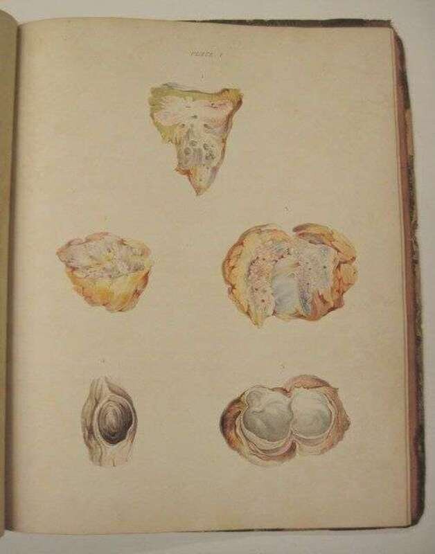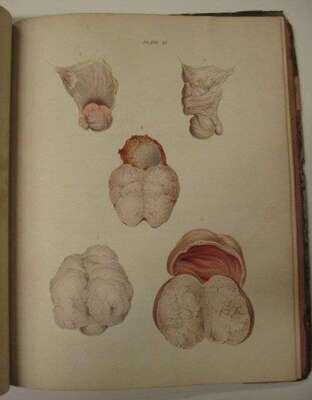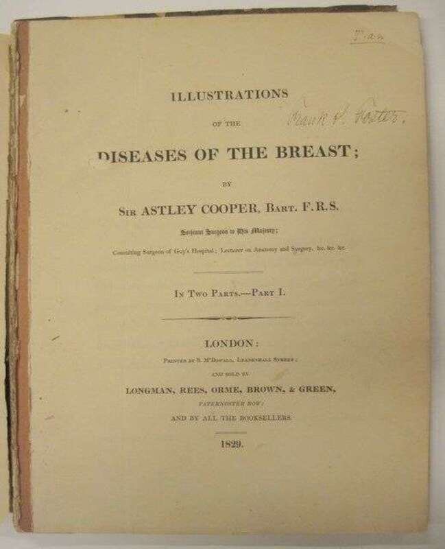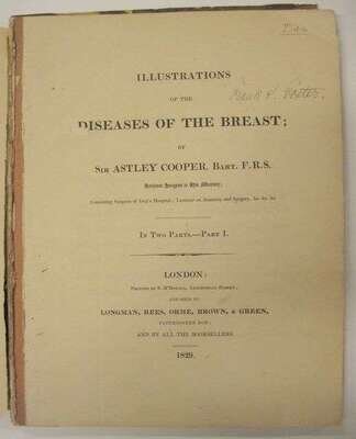 Cooper, Astley: Illustrations of the Diseases of the Breast. London: Longman, Rees, Orme..,1829. 1st ed. Part 1 - all pub. Lg. 4to, lacking front bd, bdg defective. With 8 hand-colored plates & 1 b/w plate. Plate 9 mounted. Text block sound. Front free endpapers loose, some page edge tears. Title-page with crease and very small open tear by title. Former owner's inscription to title-page. Very minor scattered occasional foxing, mostly affecting text pages, some plates with light discoloration.