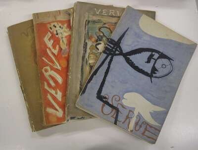 Art Periodicals: Verve. [Paris], 1938-1939. Vol. 1. No. 2-4; Vol. 2. Nos. 5 & 6. Folio, orig. illus. wrappers; worn. With color and b/w lithos, some double page, by Joan Miro, Marc Chagall, Matisse, etc. Internally generally clean.