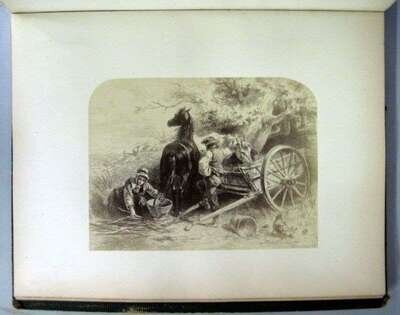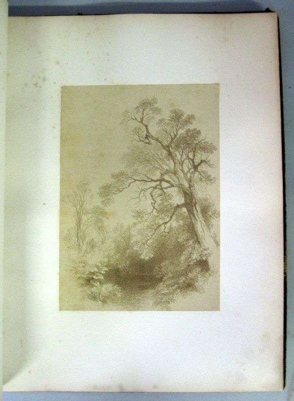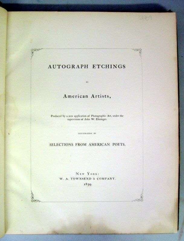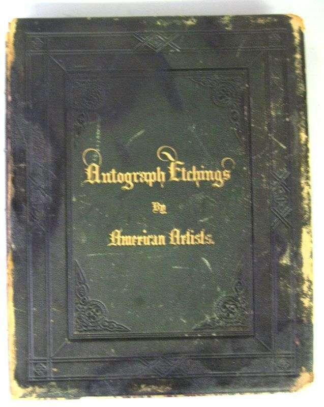 [Early Photography] Ehninger, John W. Autograph Etchings by American Artists. New York: W. A. Townsend, 1859. Sm. folio, orig. publishers gilt-lettered green morocco; spine ends, corners & edges heavily rubbed, foot of spine rubbed away, front cover detached. With 12 mounted cliche-verve plates, tissue guards. Dampstaining & darkening to bottom margins of title page & front matter, edges of mounts occasionally foxed & starting to darken.