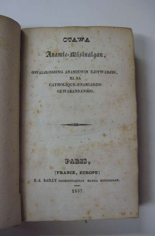 [Native American Language.] Ottawa. Anime-Misinaigan [Ottawa Prayer Book]. Paris: E.J. Bailly, 1837. 1st ed. 12mo, contemp. 1/2 cloth & bds; joints loose and beginning to fray, bds scuffed. Ex-libris ticket to front paste down, library pocket to rear paste-down. Moderate foxing.