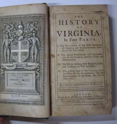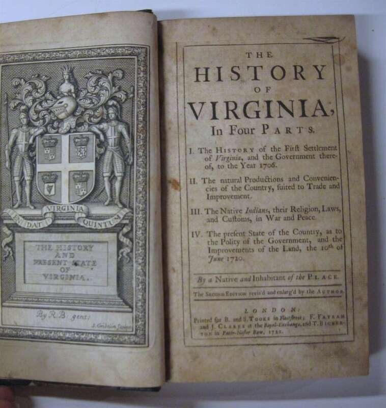 Beverley, Robert. The History of Virginia. London: B. and S. Tooke, 1722. "The Second Edition." 8vo, 3/4 blue morocco & marbled bds; corners bumped, edges worn. With frontis & 14 plates; plates with scattered repairs, some trimmed close. Lacking 4p adverts. Scattered spotting and discoloration.