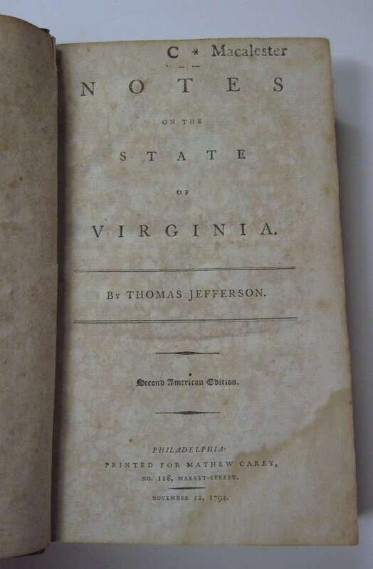 Jefferson, Thomas. Notes on the state of Virginia. Phila.: Mathew Carey, 1794. "Second American Edition." 8vo, contemp. calf, red morocco spine label; edges worn. With fold table, lacking map of Virginia. Scattered spotting and some dampstaining. With owner's stamp of Charles Macalester I on title page.