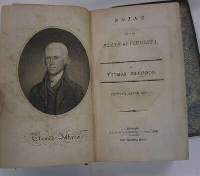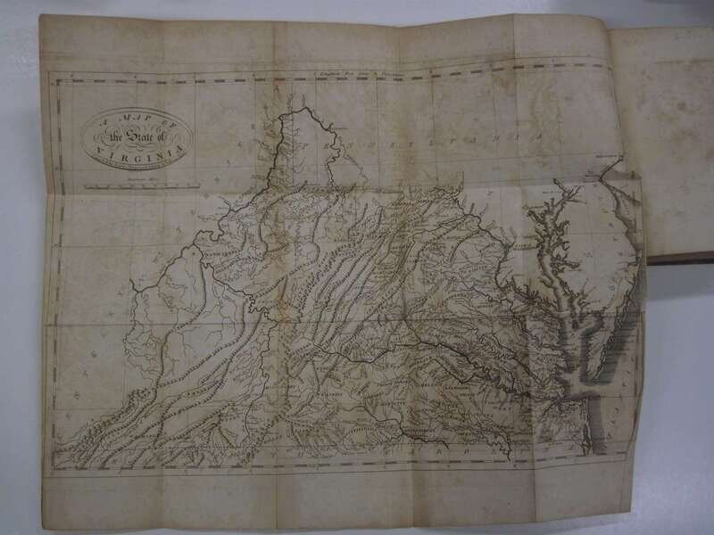 Jefferson, Thomas. Notes on the State of Virginia. Phila: R.T. Rawle, 1801. "First Hot-Pressed Edition". 8vo, contemp. calf; lacking front cover. With fold map, port., 2 plans, fold table. Without the view of the Natural Bridge. With Jefferson's corrections on the Logan Affair. Light to moderate foxing & offsetting at edges - no loss of paper. Moderate foxing to plans. Scattered light foxing to text. Crisp copy.