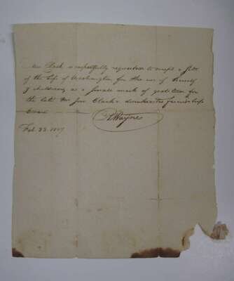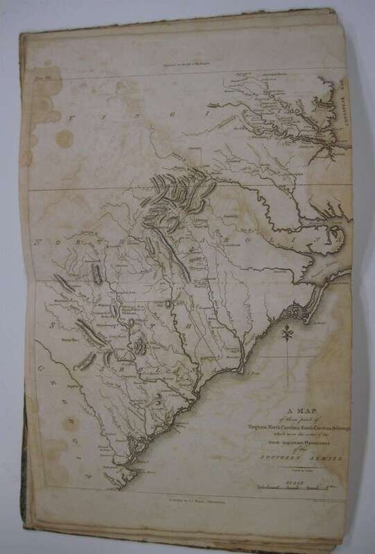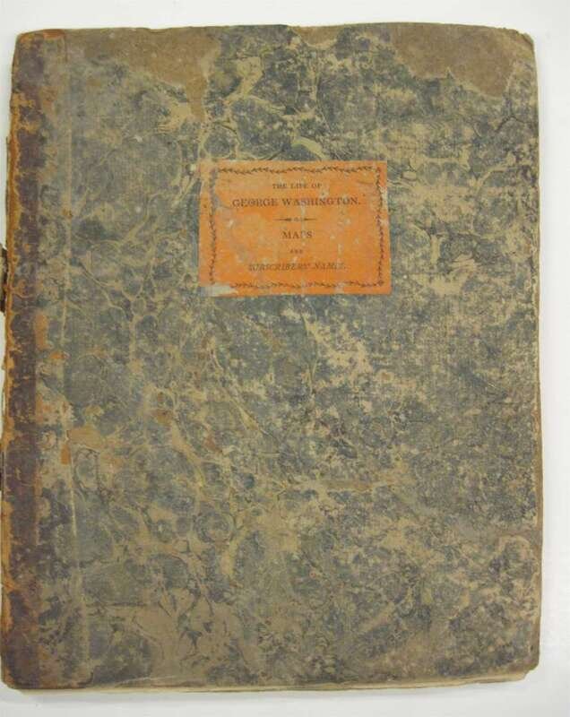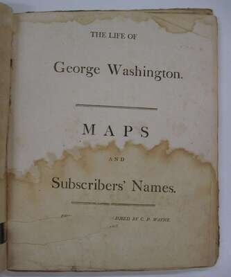 Marshall, John. The Life of George Washington. Phila.: C.P. Wayne, 1807. 1st ed. Atlas vol. only. 4to, orig. bds & printed cover label; bds rubbed & worn, spine gone, covers detached or detaching. With 10 double-page & fold maps, 22pp subscriber's names. Heavy dampstaining to bottom half of title page & front matter, heavy to moderate dampstaining to bottoms of maps. Presentation copy from the publisher, autograph note signed by C.P. Wayne, dated "Feb. 23, 1807" to Mrs Clark, "...as a small mark...for the late Mr. Clark's disinterested friendship..."