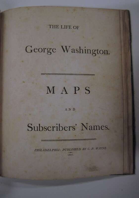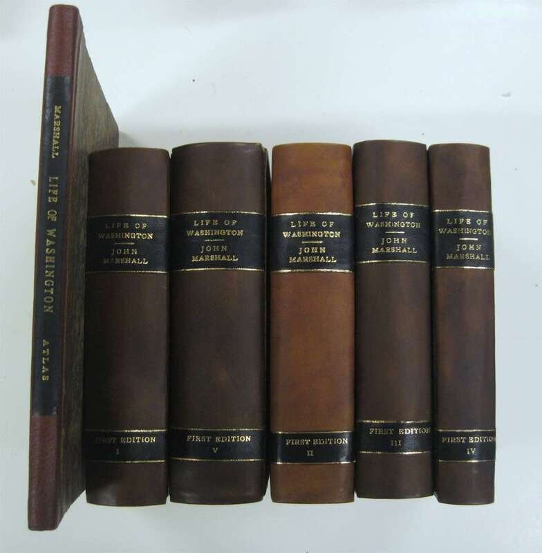 Marshall, John. The Life of George Washington. Phila: C.P. Wayne, 1804-1807. 8vo, contemp. tree calf; rebacked, new endpapers + 4to atlas vol., orig. calf & marbled bds, rebacked. Port. + 8 (of 10) double-page & fold maps. 22pp subscriber's list. Some dampstaining to vol. 1 front matter - incl. port., some dampstaining to subscriber's list, scattered light foxing to text & maps - some offsetting on maps. Lacking maps 2 & 3 in atlas vol.