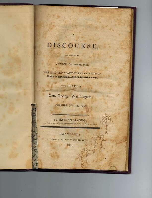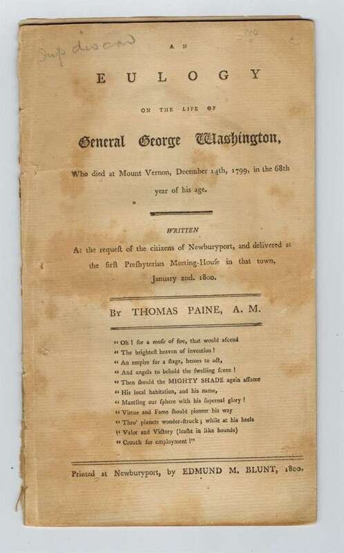 George Washington - Eulogies & C: Minot, George Richards. An Eulogy on George Washington. Boston: Manning & Loring, (1800). 2nd ed. 8vo, orig. self wrappers; minor edge wear. Untrimmed. Clean & attractive with orig. thread. Evans 37967. * Paine, Thomas. An Eulogy on the Life of General George Washington. Newbury Port: Edmund M. Blunt, 1800. 8vo, orig. self-wrappers; minor discoloration, disbound & trimmed. Without urn on last page. Evans 38178. * Strong, Nathan. A Discourse on Friday, December 27, 1799...to Lament,...the Death of Gen. George Washington. Hartford: Hudson and Goodwin, 1800. 8vo, modern cloth. Lacking 1/2 title. Front & back matter moderately toned & foxed. Last leaf heavily but extraneously annotated in contemp. ink. Evans 38577. Bound with Flint, Able. A Discourse,...Feb. 22, 1800, ...Memory of General George Washington,... Hartford: Hudson and Goodwin, 1800. 8vo, 1/2 title present, but foxed & torn at head, text often foxed & occasionally blistered. Evans 37430.