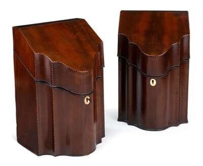 With serpentine facades with "barber pole" inlay and ivory escutcheons, fitted interiors.