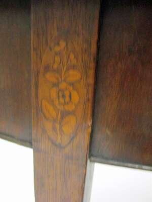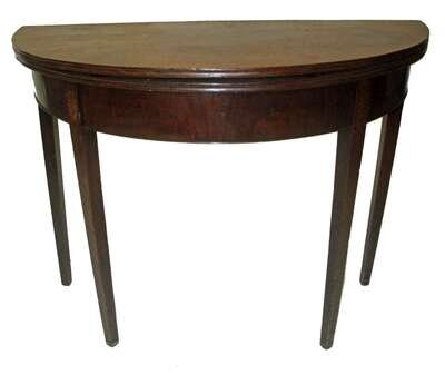Demilune top to molded edge on squared tapering legs inlaid with floral ovals at frieze.