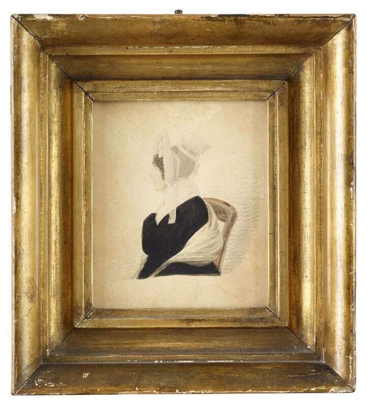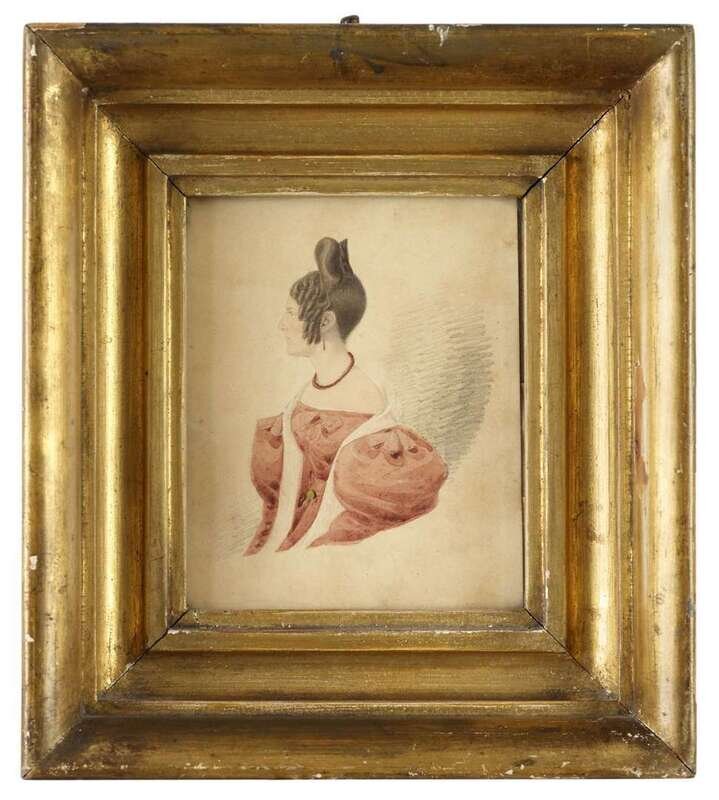 The first, inscribed on backboard, "Hannah Allen New Port Newf, VA 1826 -Harriet James Tucker of Petersburg, Va" and the second inscribed, "Mrs. Enoch Allen nee Green Newport Newf, Va 1826," watercolor and ink on paper, framed.