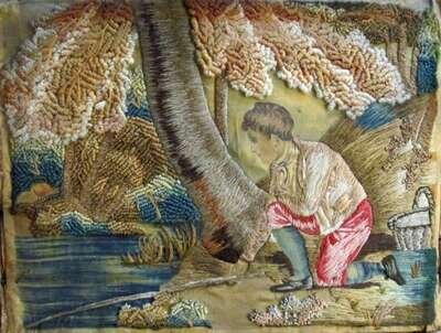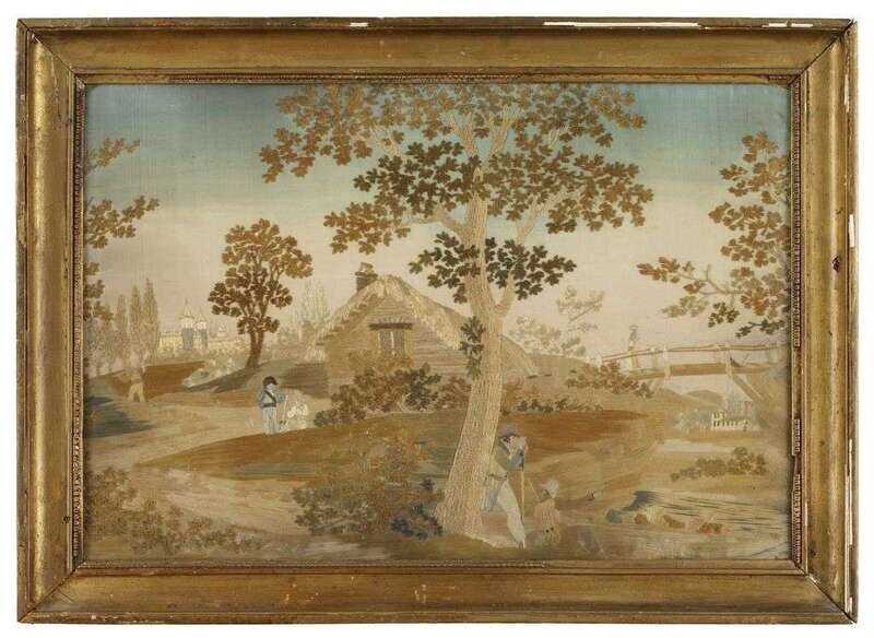 Worked with chenille, silk and watercolor on a silk ground, framed; together with a wool-worked and watercolor picture of a boy near a stream, eglomise mat, framed.