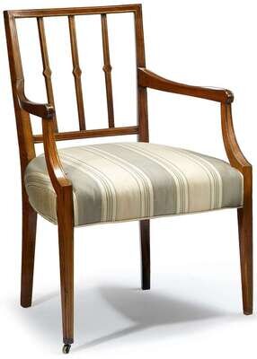 Squared back enclosing three rectangular splats, sloping arms, armrests and squared tapering legs, all with brass inlay.