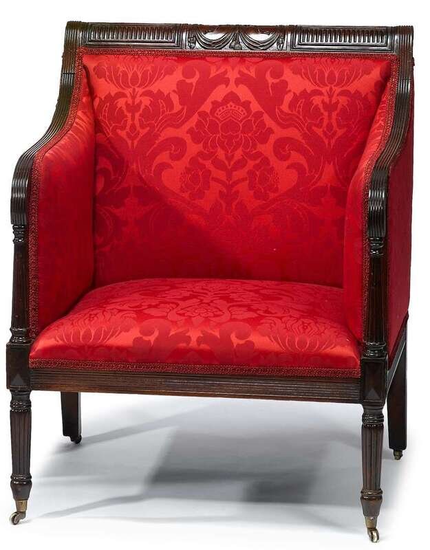 Crestrail carved with swags and tassels above upholstered back, reeded downswept stiles continuing to arms on reeded columnar supports, reeded seat rail, reeded tapering legs ending in casters.