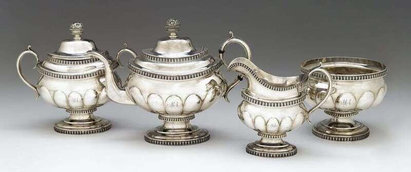 Comprising a teapot, covered sugar, waste bowl and creamer, each with lobed body with egg-and-tongue bands, raised on conforming pedestal foot, the teapot and covered sugar with spherical chased floral basket finials to domed lids, monogram.