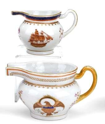 Each of bulbous form, the first, decorated with polychrome American eagle emblazoned with shield; the second, with a sepia three-masted ship at sea, both embellished with sprigs.