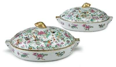 Pair of Chinese Export porcelain Famille Rose warming dishes with covers 19th century