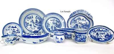 Including two covered vegetable dishes, oval platter, two small octagonal platters, shrimp dish, two rectangular serving dishes, gravy boat, creamer, covered sugar bowl, three egg cups, oval stand, six butter pats, leaf-shaped dish, 32 plates in assorted sizes, five shallow bowls, 12 saucers and six teacups and eight tea bowls, approx. 85 pieces.