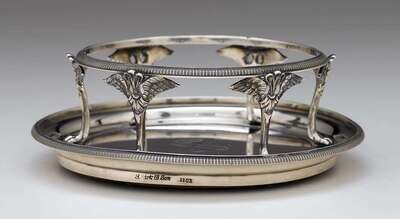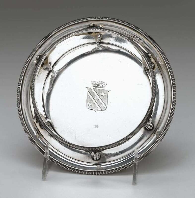 The base of circular form with reeded edge, mounted with six winged lion-paw monopediae supporting smaller, reeded ring, the base engraved with the Bonaparte Family coat-of-arms.