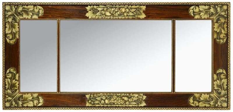 Rectangular three-part mirror stencil-decorated in gold with neoclassical borders, leafage and arrangements of fruit.