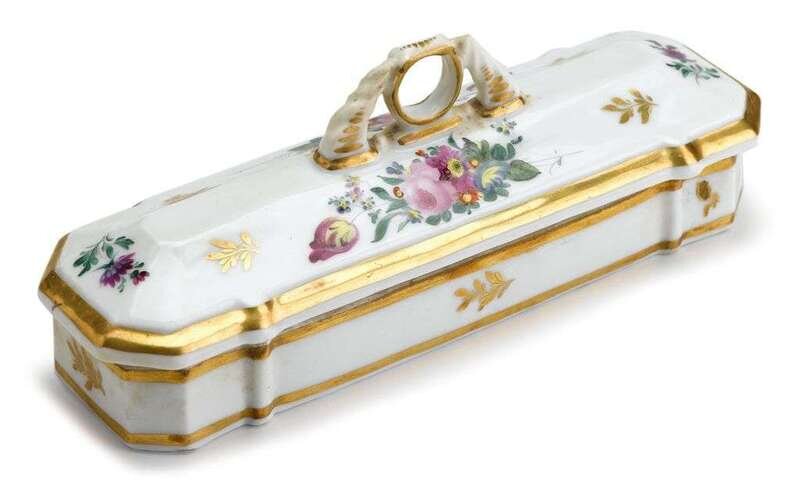 The elongated urn form pitcher and bowl decorated with polychrome floral and gilt leafy sprays, the pitcher with incised "W" (for Andrew Craig Walker) to underside; together with a similarly decorated covered box, with incised "C" to underside.