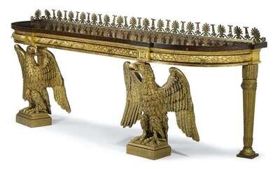 The brass gallery of anthemion and husks above faux-porphyrized, shaped mahogany top and four drawers with ribbon-tied laurel carved and gilded facades, on two composition eagle-form front supports and columnar rear supports.