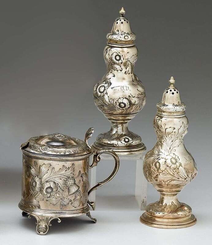 Pair of silver repousse salt and pepper shakers john c. moore and robert rait, new york, new york, first half 19th century