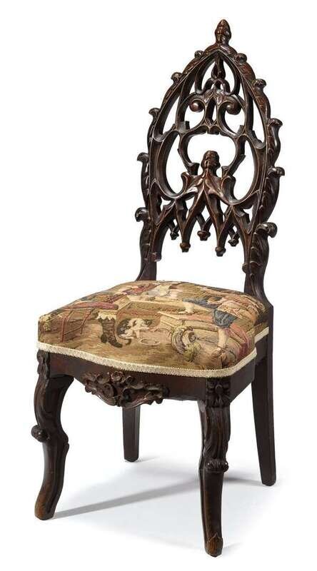 The arched spurred back enclosing tracery on an upholstered shaped seat with carved seat rail, shaped carved legs.