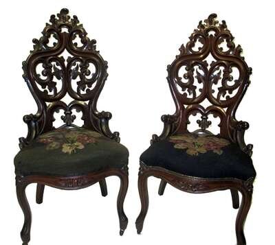 Two carved Rococo Revival rosewood slipper chairs circa 1865