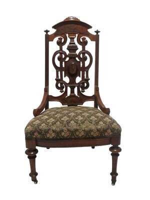 With arched crestrail above a scrolled, inlaid and openwork back, overupholstered seat on trumpet turned legs, casters.