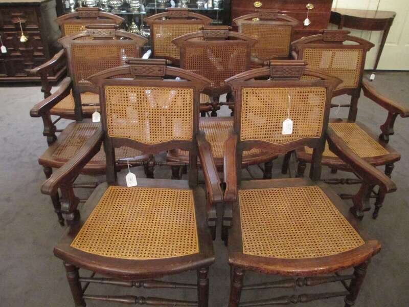 Each with arched cresting above caned back, incised and shaped arms, caned seat with triangular drop above turned legs joined by turned stretchers.
