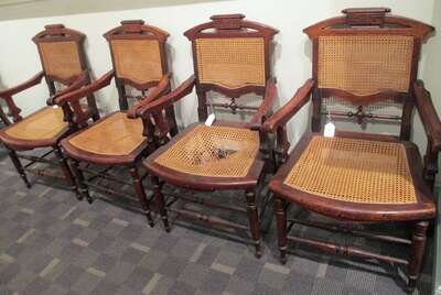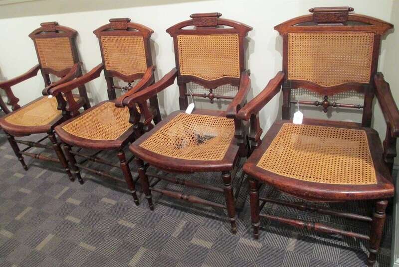 Each with arched cresting above caned back, incised and shaped arms, caned seat with triangular drop above turned legs joined by turned stretchers.