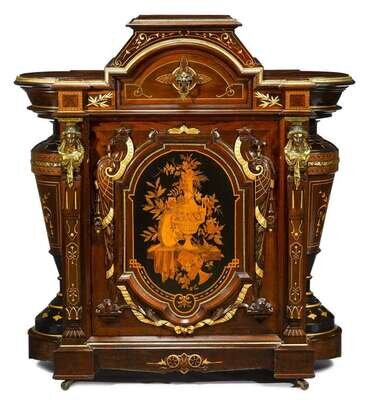 Stepped and shaped top with bronze banding above arched drawer with mask pull and marquetry door (attributed to Joseph Cremer (French, active in New York in the 1860s)) figured with tableau depicting a flower-filled urn and musical instruments, opening to a bird's-eye maple interior, flanked by gilt bronze busts and pilasters, urn form ends, shaped base on casters, incised and gilded throughout.